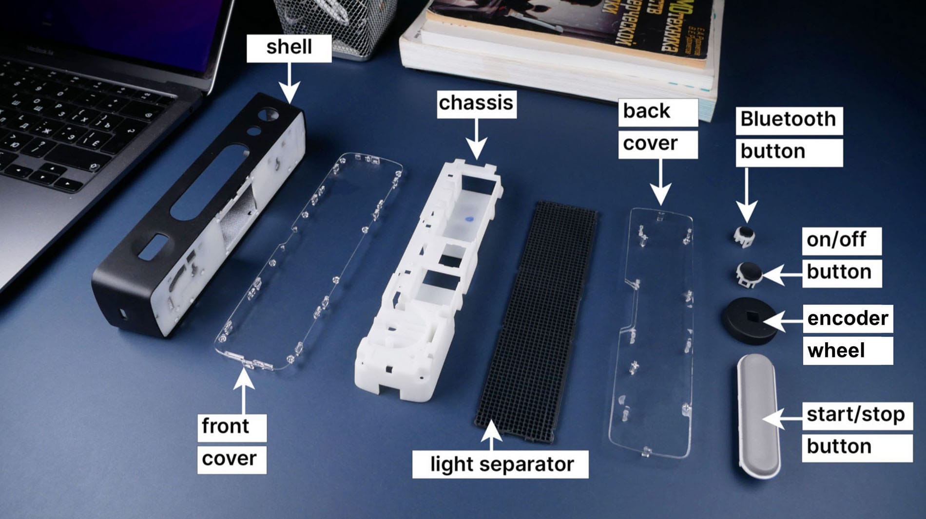 Casing parts were printed using stereolithography (SLA) printing. With SLA, I printed all the latches so precisely that we were able to assemble the prototype almost as it will be in mass production.