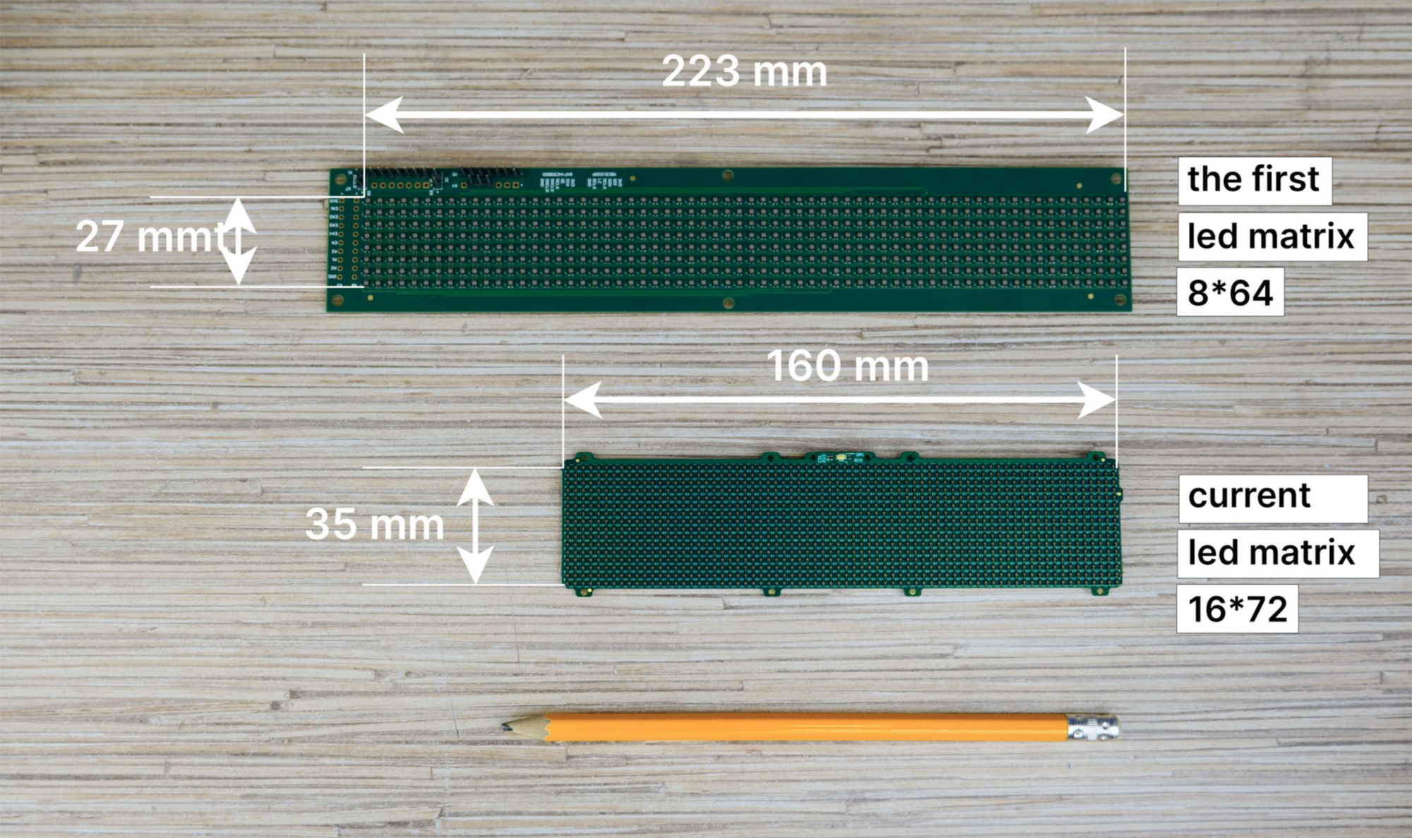 The original matrix was 8x64 pixels: 2.1 x 2.1 mm LEDs at 1.6 mm apart. However, that size made the device non-portable. Here’s a comparison picture with our current, smaller prototype.