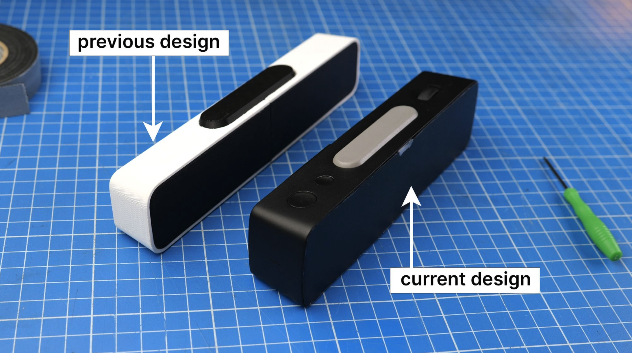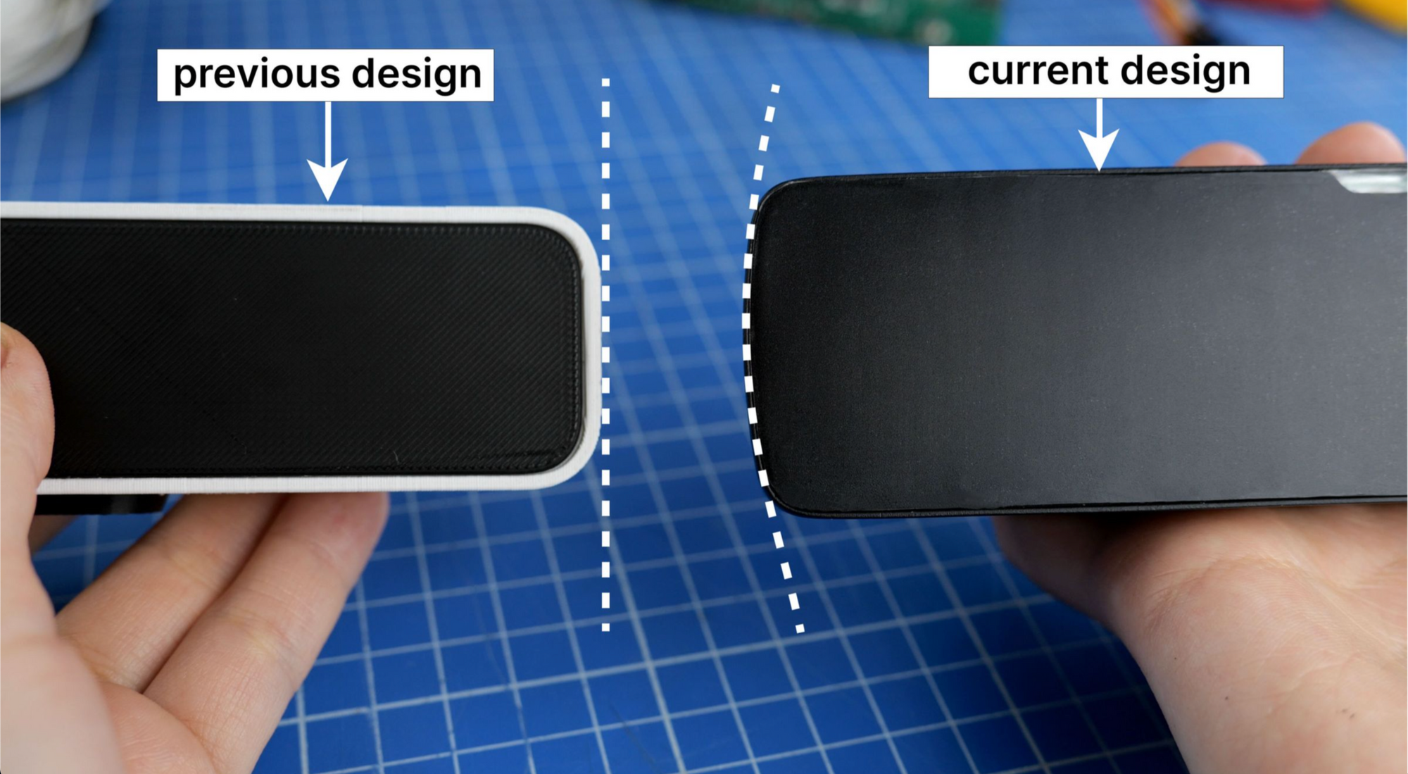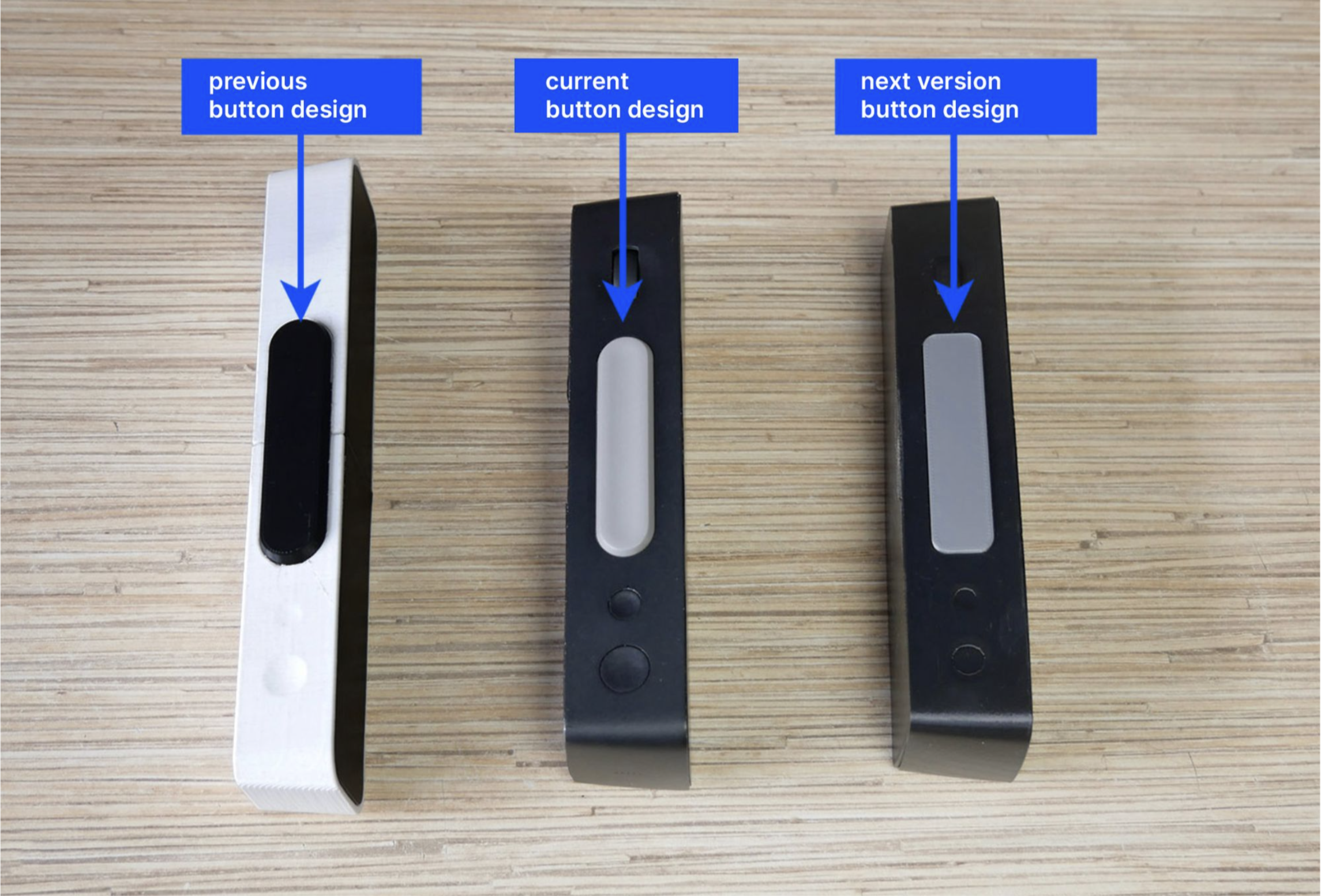Keeping the large button’s form from the initial design didn’t harmonize with the device’s sleek lines upon hands-on inspection. Thus, the upcoming iteration will feature a subtly larger button with a rounded-rectangular shape, ensuring a seamless, unified design aesthetic.