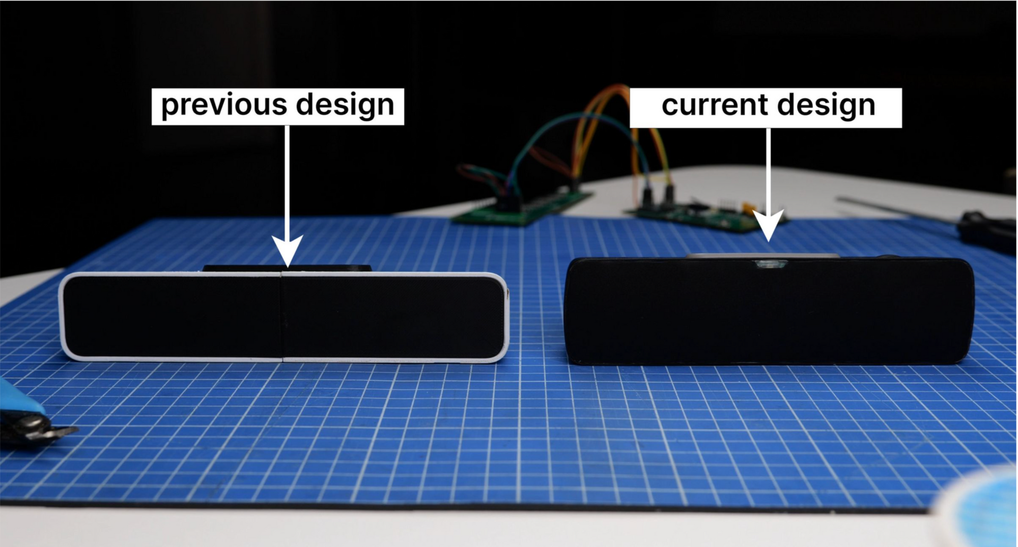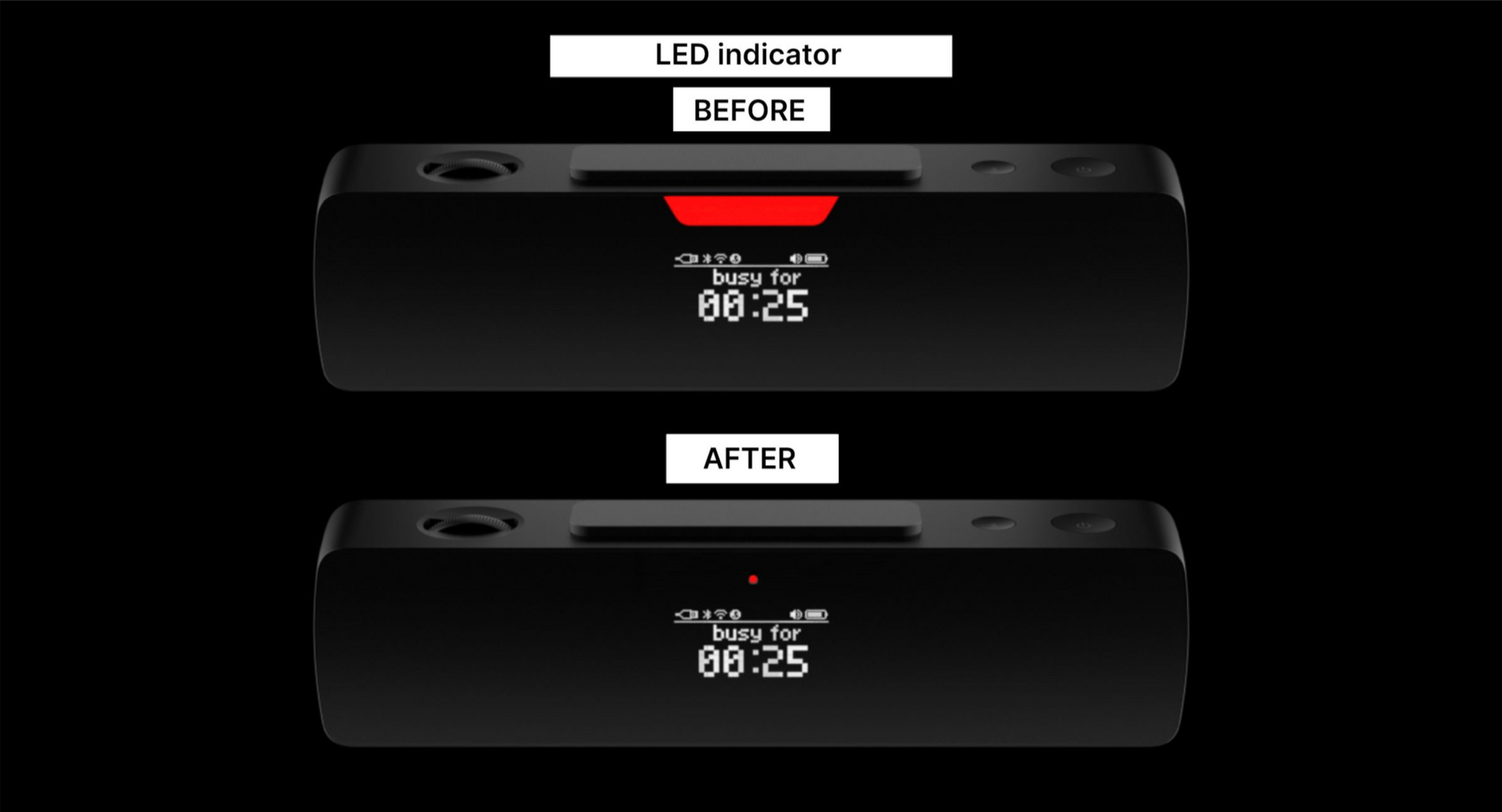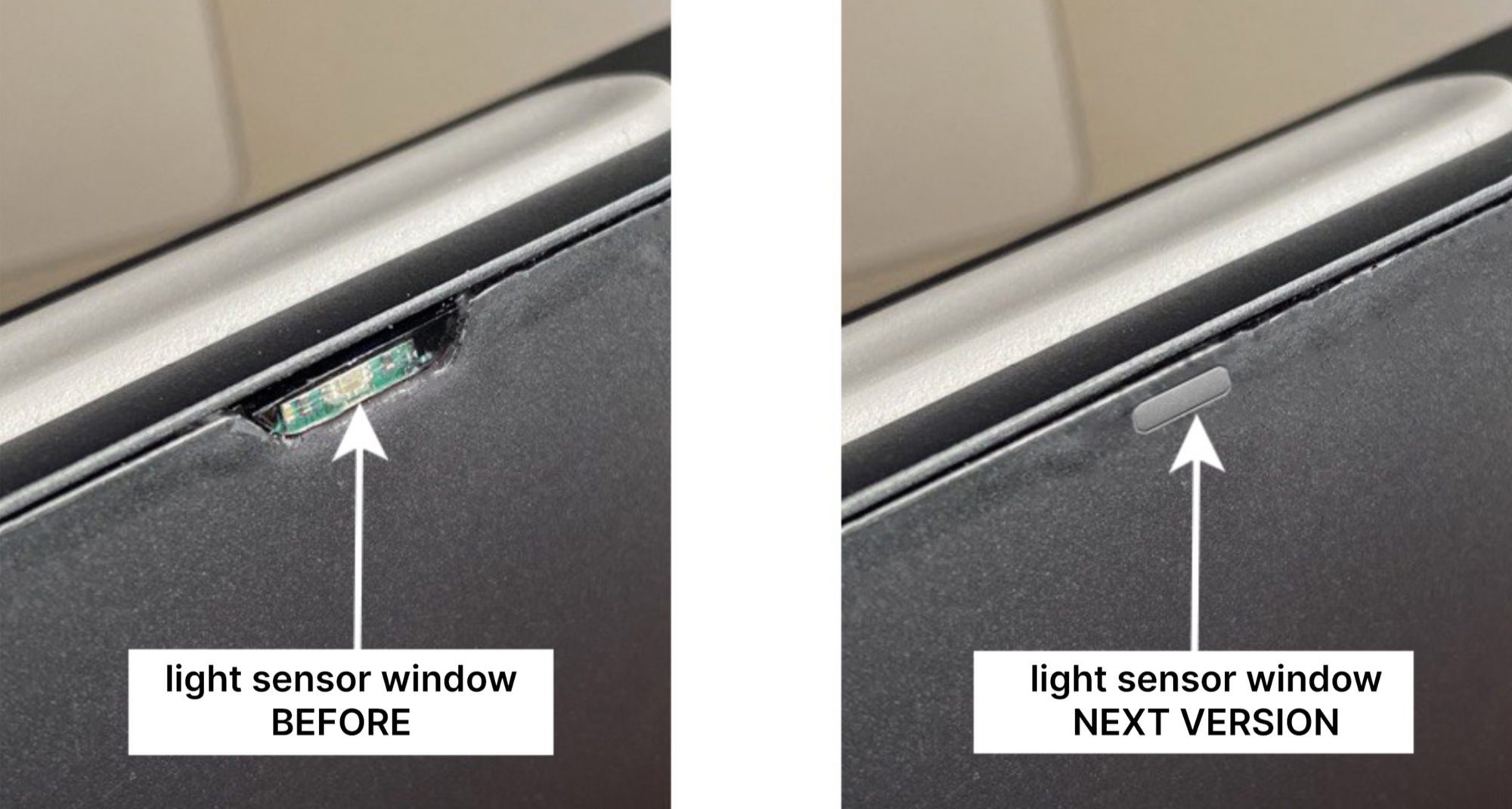We’ve installed an ambient light sensor on the device’s front for automatic LED brightness adjustment. The sensor’s window design is similar to the light indicator’s back window. However, after assembling the prototype, we found it to be too large, revealing the green color of the board housing the sensor. In the next iteration, the window will be smaller and have a different shape.