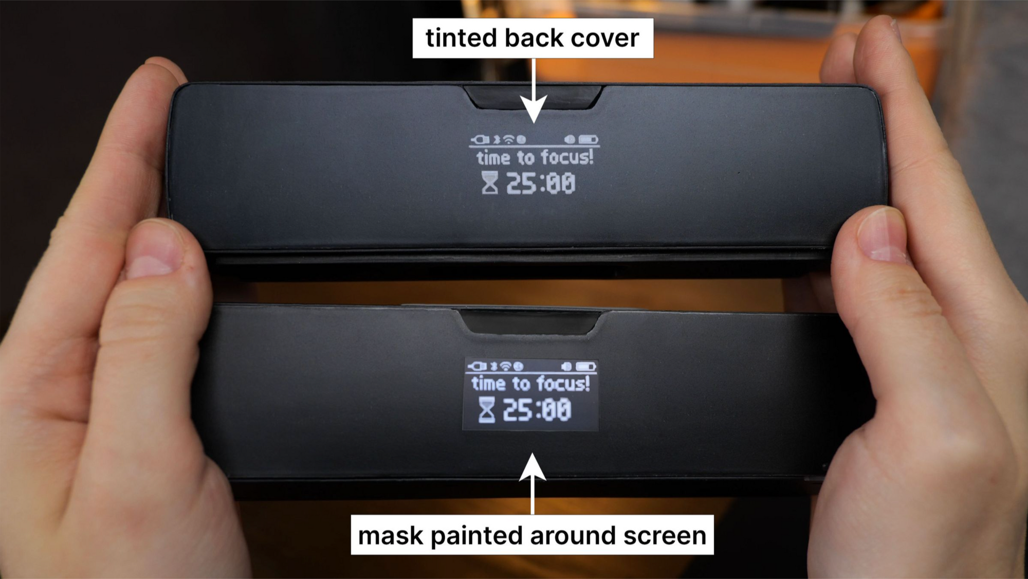- A fully transparent back cover with a black mask applied, leaving only the display’s active zone behind the transparent plastic. This solution extends the lifespan but reveals the display frames when it is turned off.