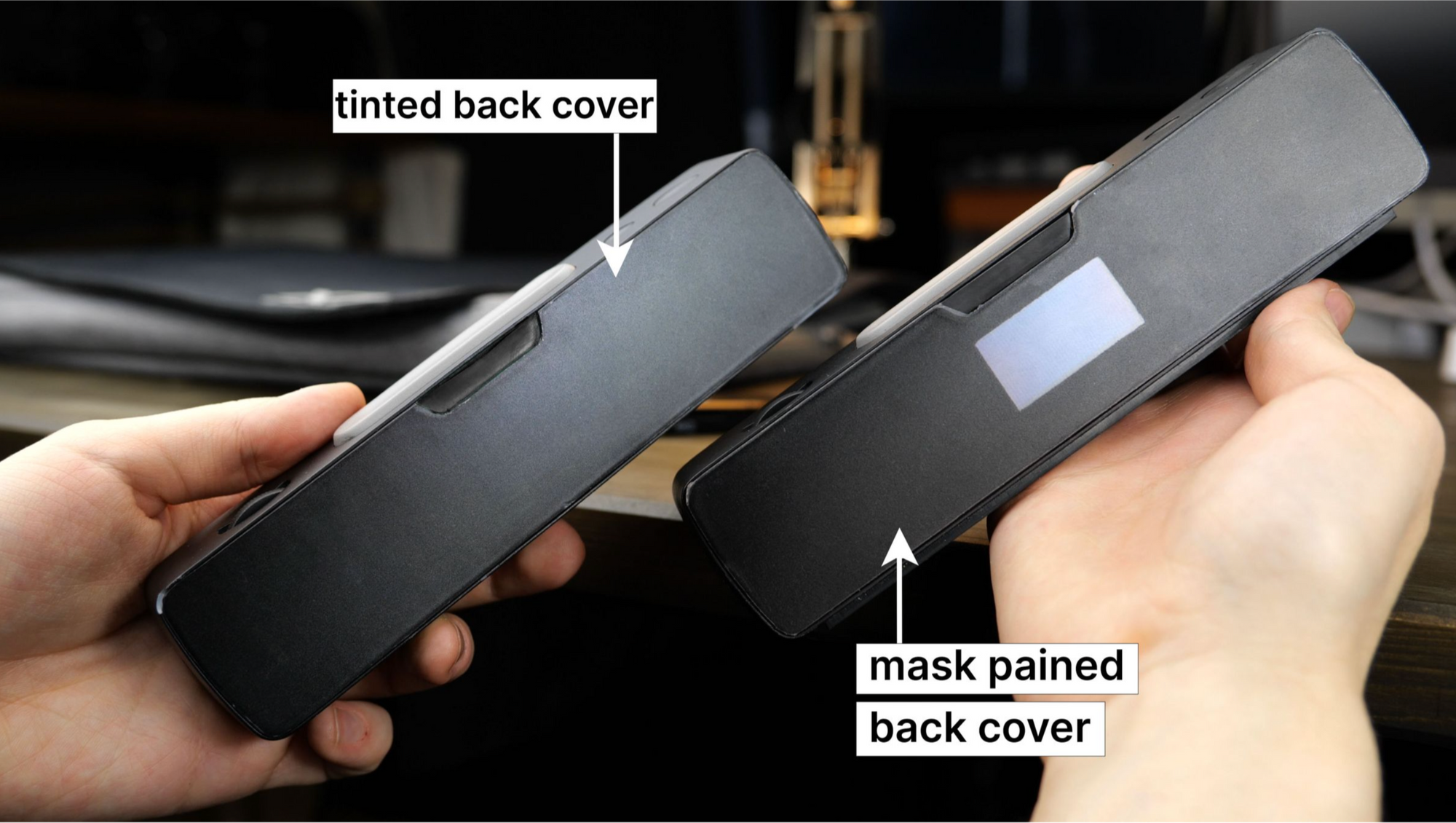 With the tinted glass, the rear surface appears uniformly dark when the display is off, while the masked option reveals the display frames, resulting in a mixed impression. Which option do you prefer? Currently, we lean towards the tinted cover without frames.