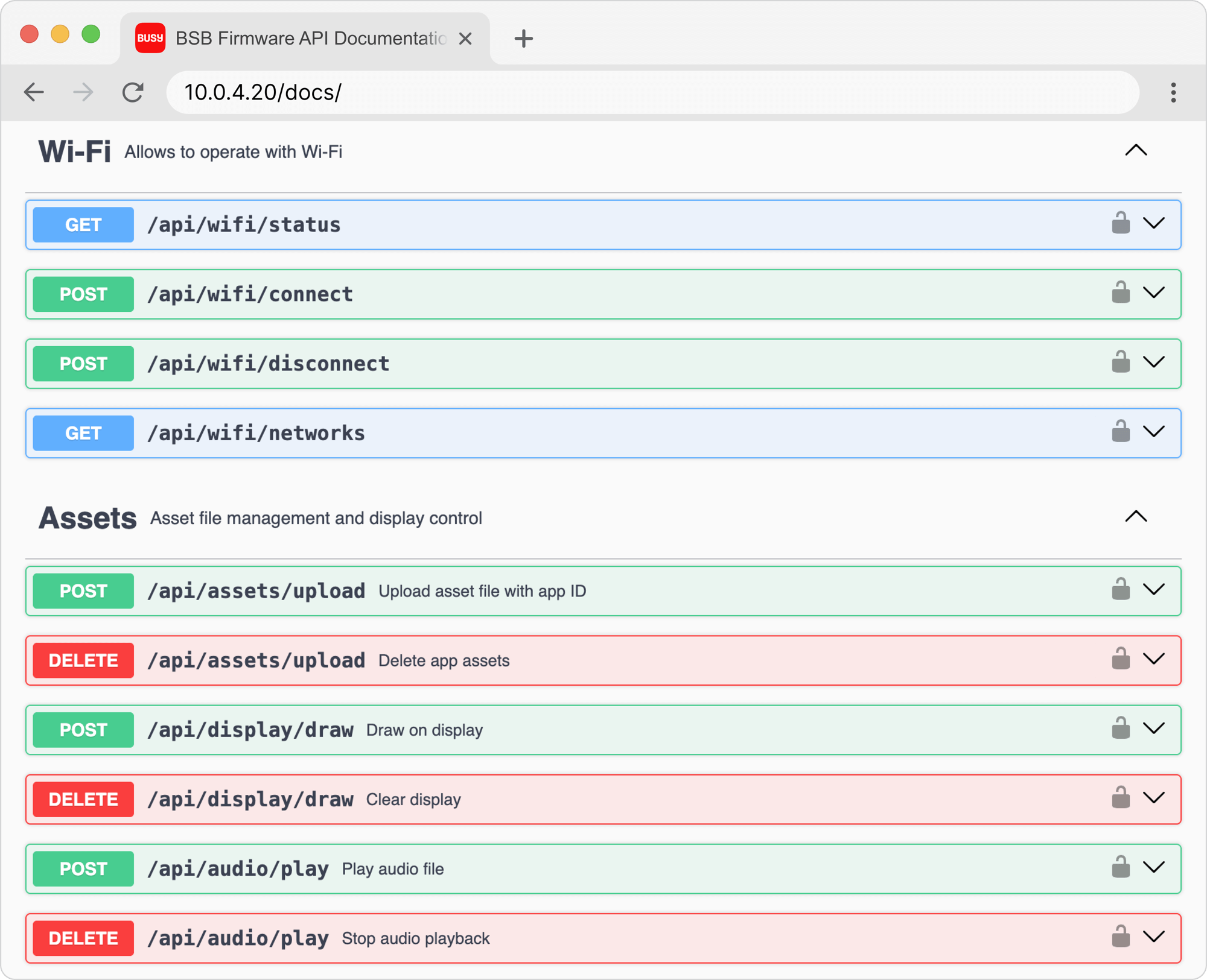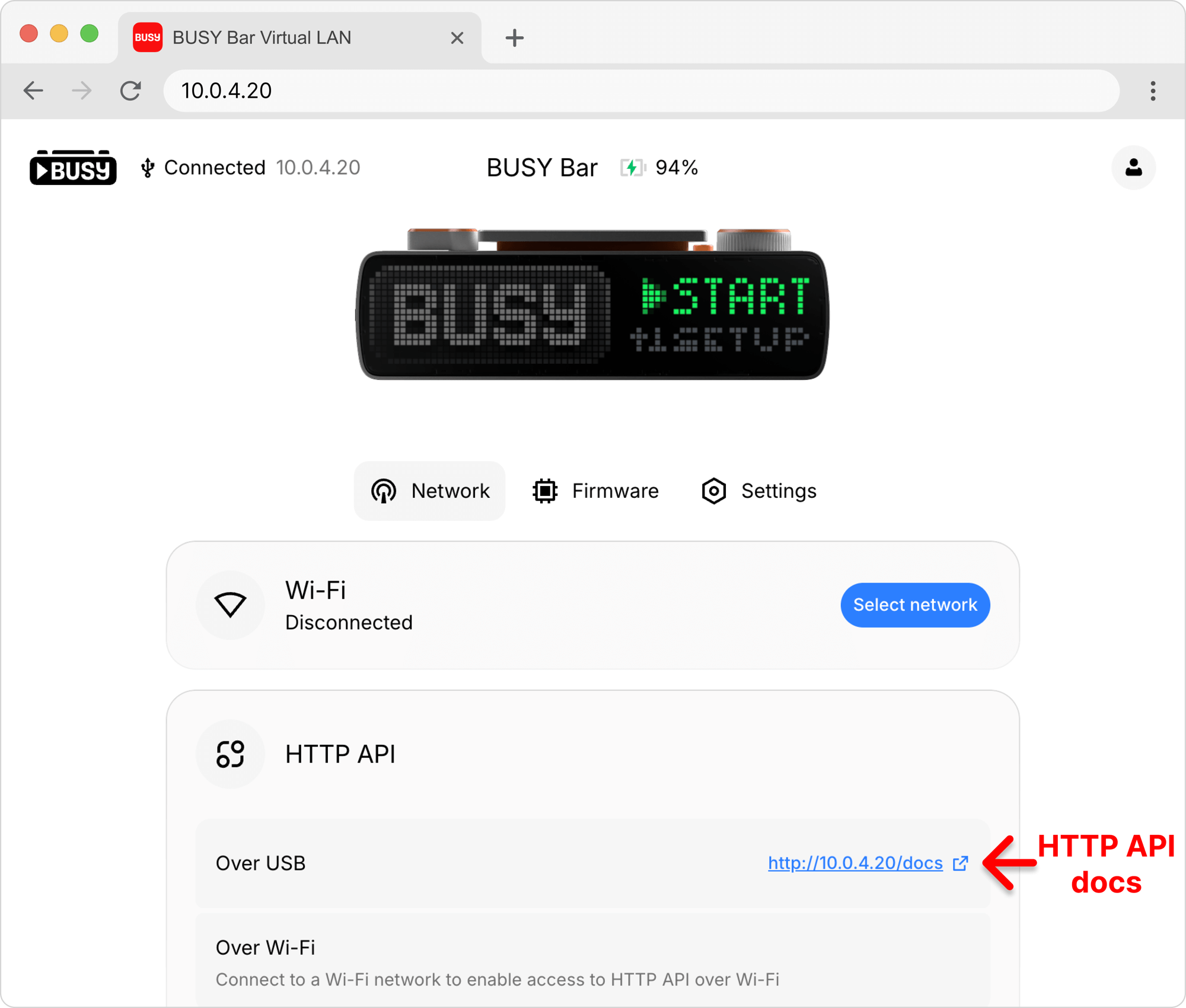 The HTTP API docs are also accessible from the BUSY Bar web interface home page, which is located at http://10.0.4.20.