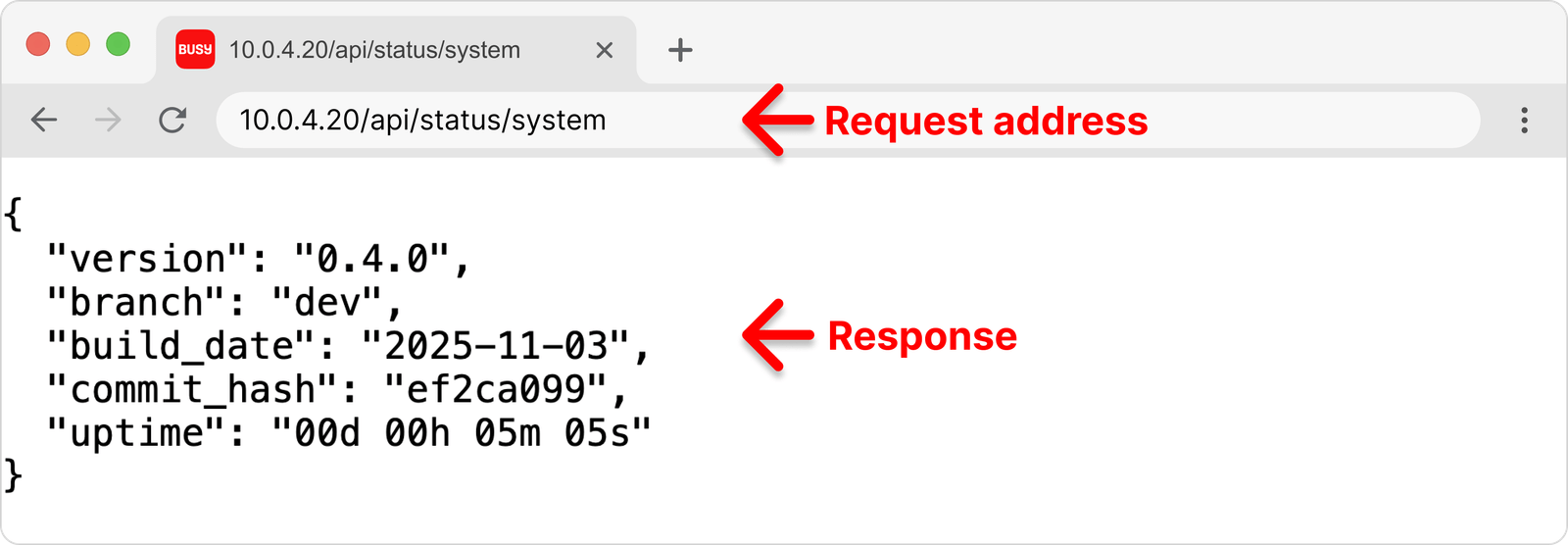Thanks to the wide support of HTTP in programming languages, it’s possible to communicate with BUSY Bar using just a few lines of code. Some simple requests, like getting general information about BUSY Bar, can be sent directly through the browser — just go to http://10.0.4.20/api/status/system.