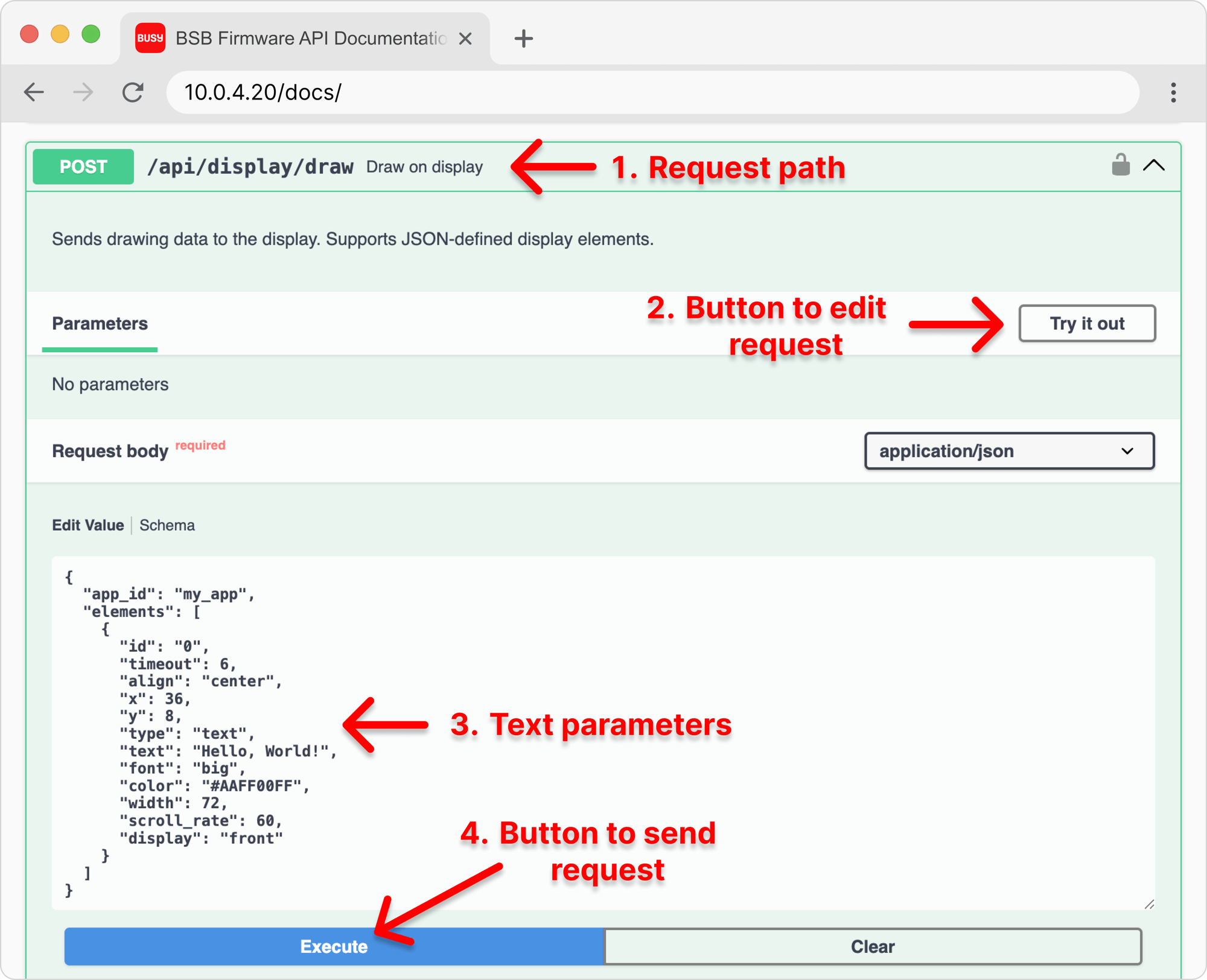 /api/display/draw(for displaying text and images on the BUSY Bar screen). - Click Try it out.