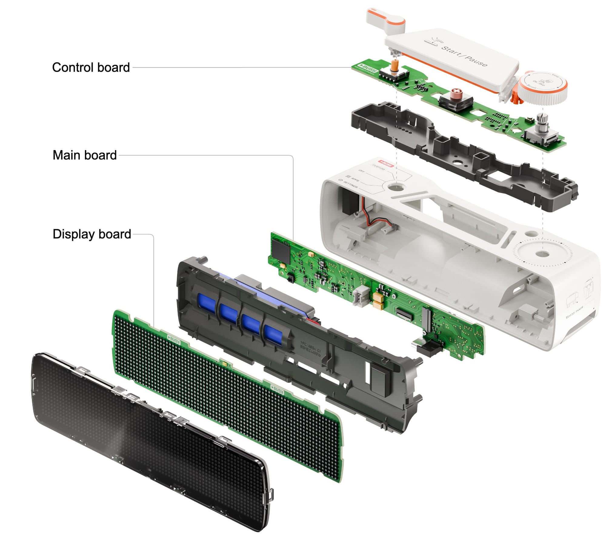 We designed the Developer Board so that it can be connected to an assembled BUSY Bar — simply remove the Start/Pause button knob and screw the board onto the device. The electrical connection between the debug board and the Control PCB is made via pogo pins.