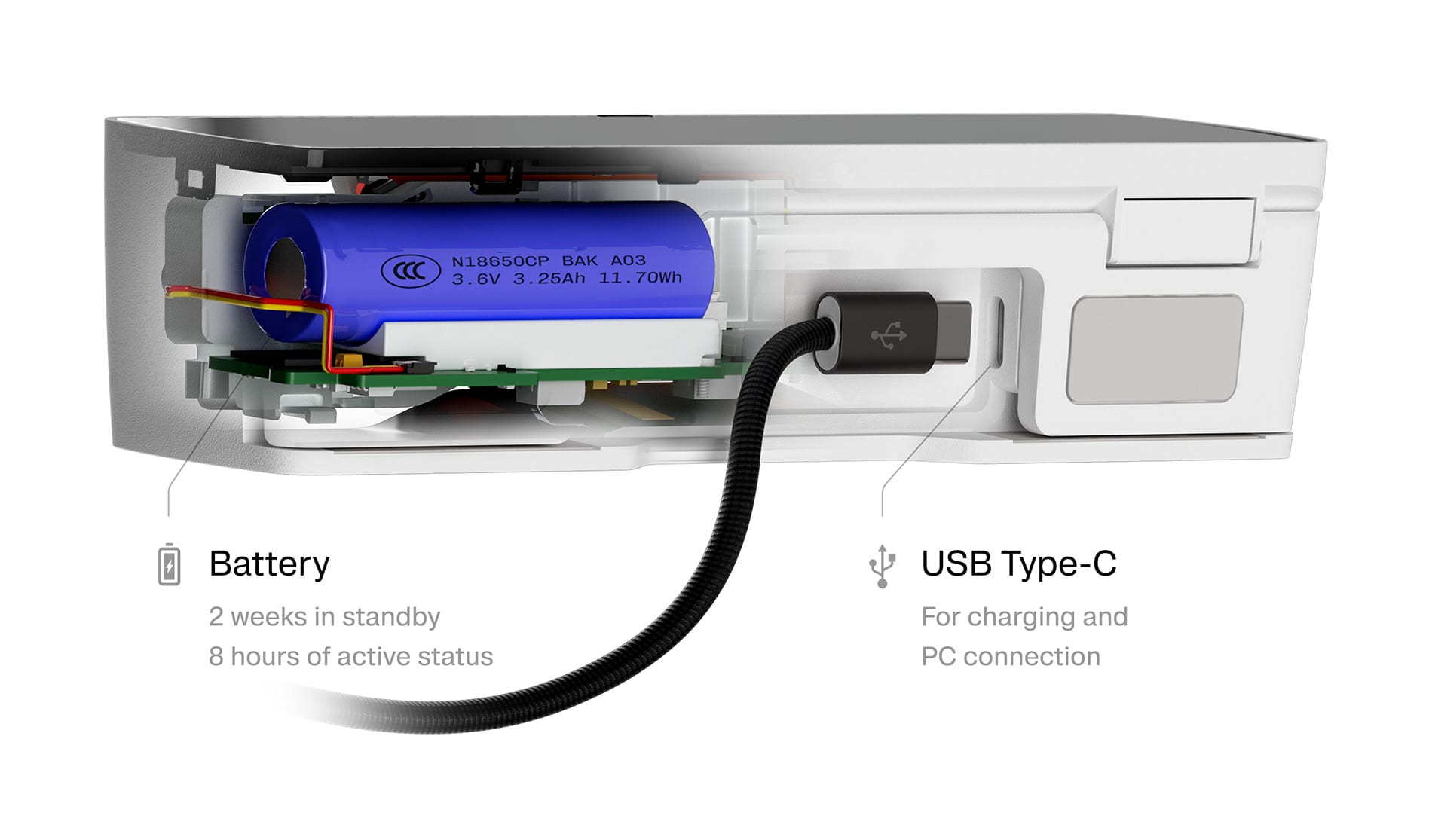 - Built-in 18650 battery — a 3,250 mAh battery is enough to power the device autonomously for an entire workday on a single charge.