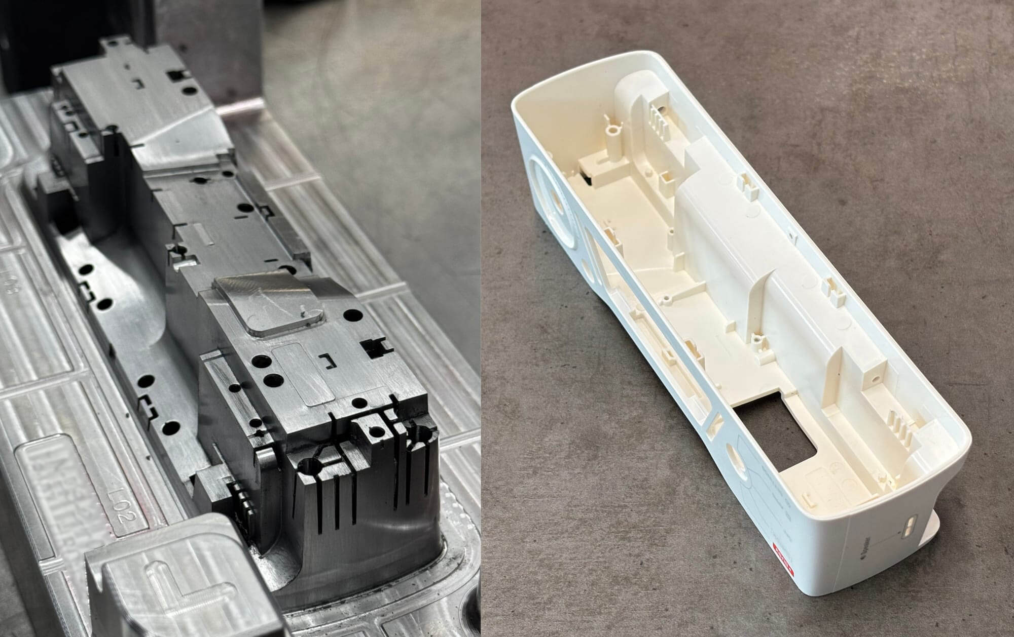 For colorful plastic parts we’re using two-shot injection molding. It involves injecting two different plastics in two stages, in the same mold. It’s a more durable solution for creating bicolor plastic parts compared to painting.
