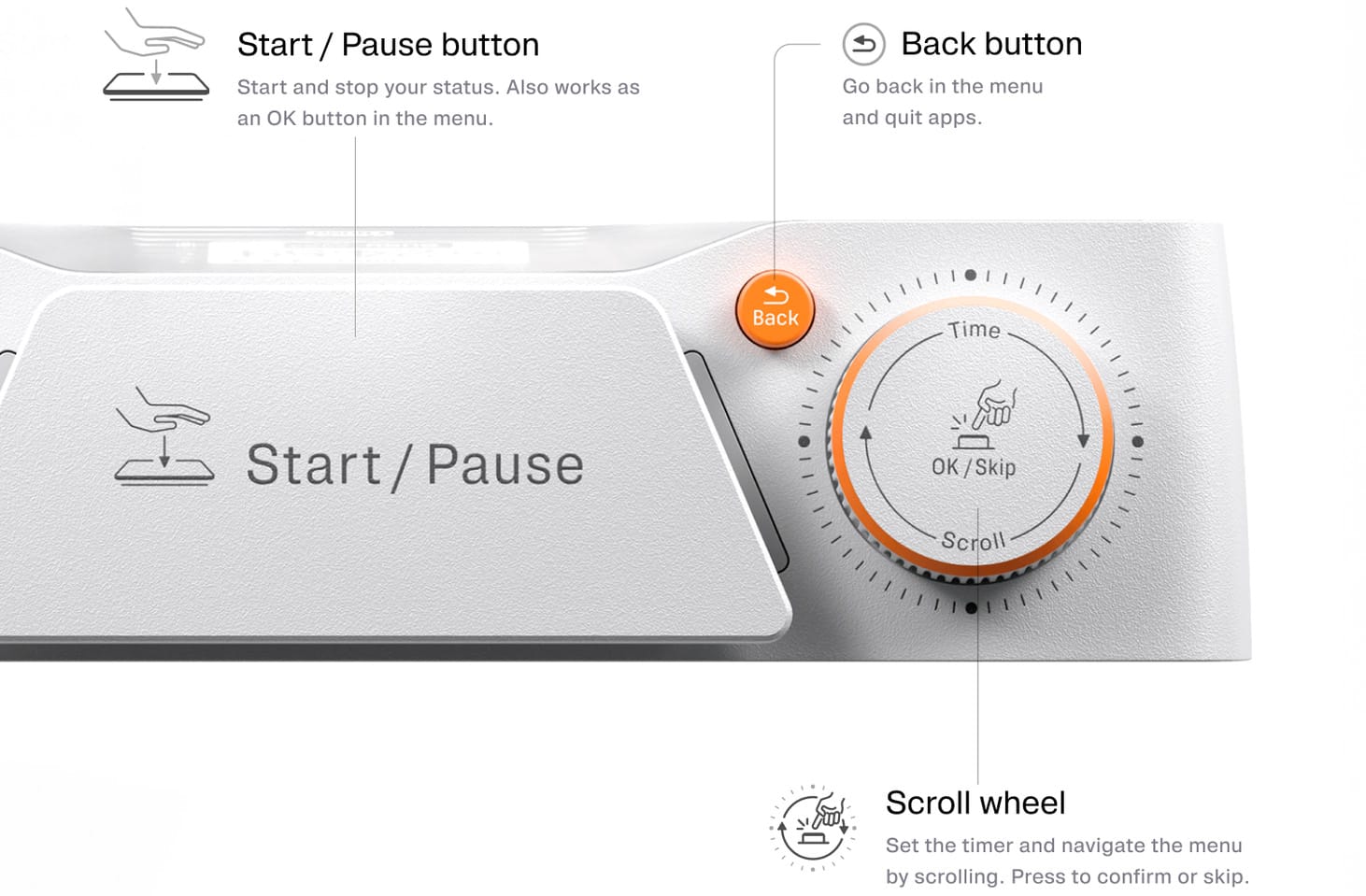 - Scroll wheel — lets you quickly set a custom timer with a scroll and press. It’s also used for navigating through menus.