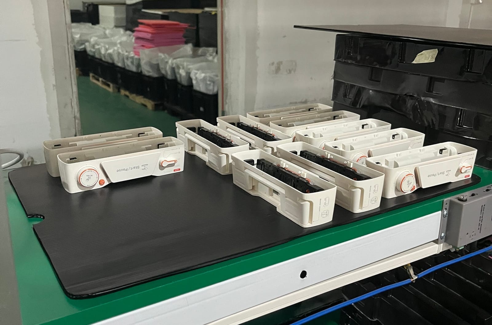 We use in-mold labeling for the back cover and its text instructions. A pre-printed black label is placed into the mold, and injected molten transparent plastic covers the label and bonds them together. This creates a permanent and premium finish, and prevents text from wearing off.