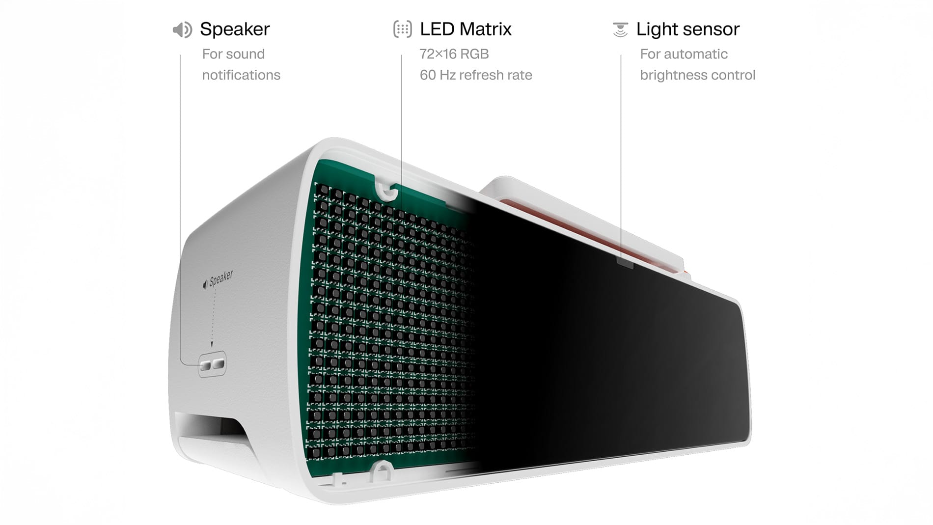 - Main display — a full-color LED matrix with a 72×16-pixel resolution,