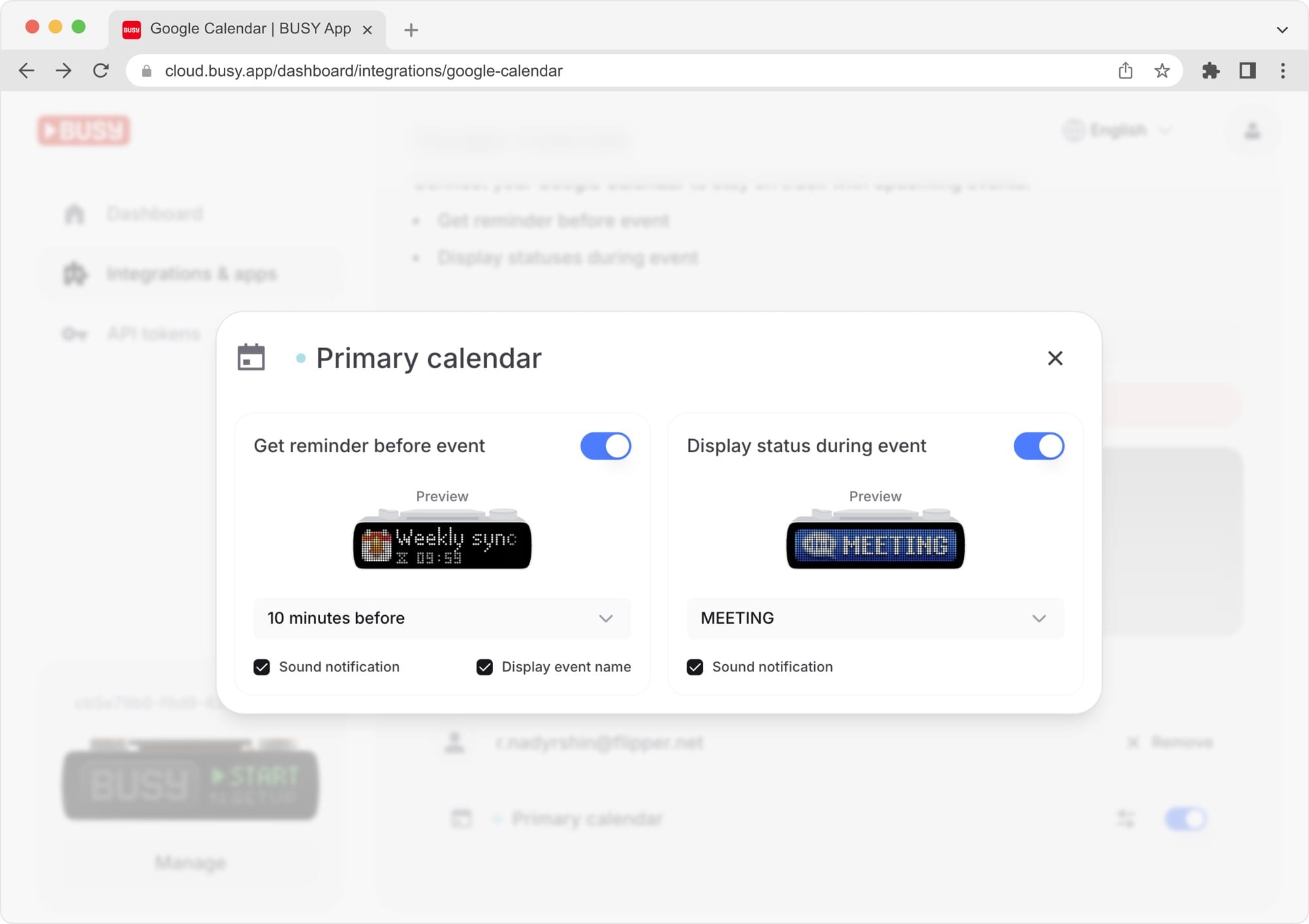 The integration is set up in your BUSY account. You can add multiple Google accounts and choose one or more calendars. You can also select the displayed status and set reminder timing. For privacy, event titles can be hidden.