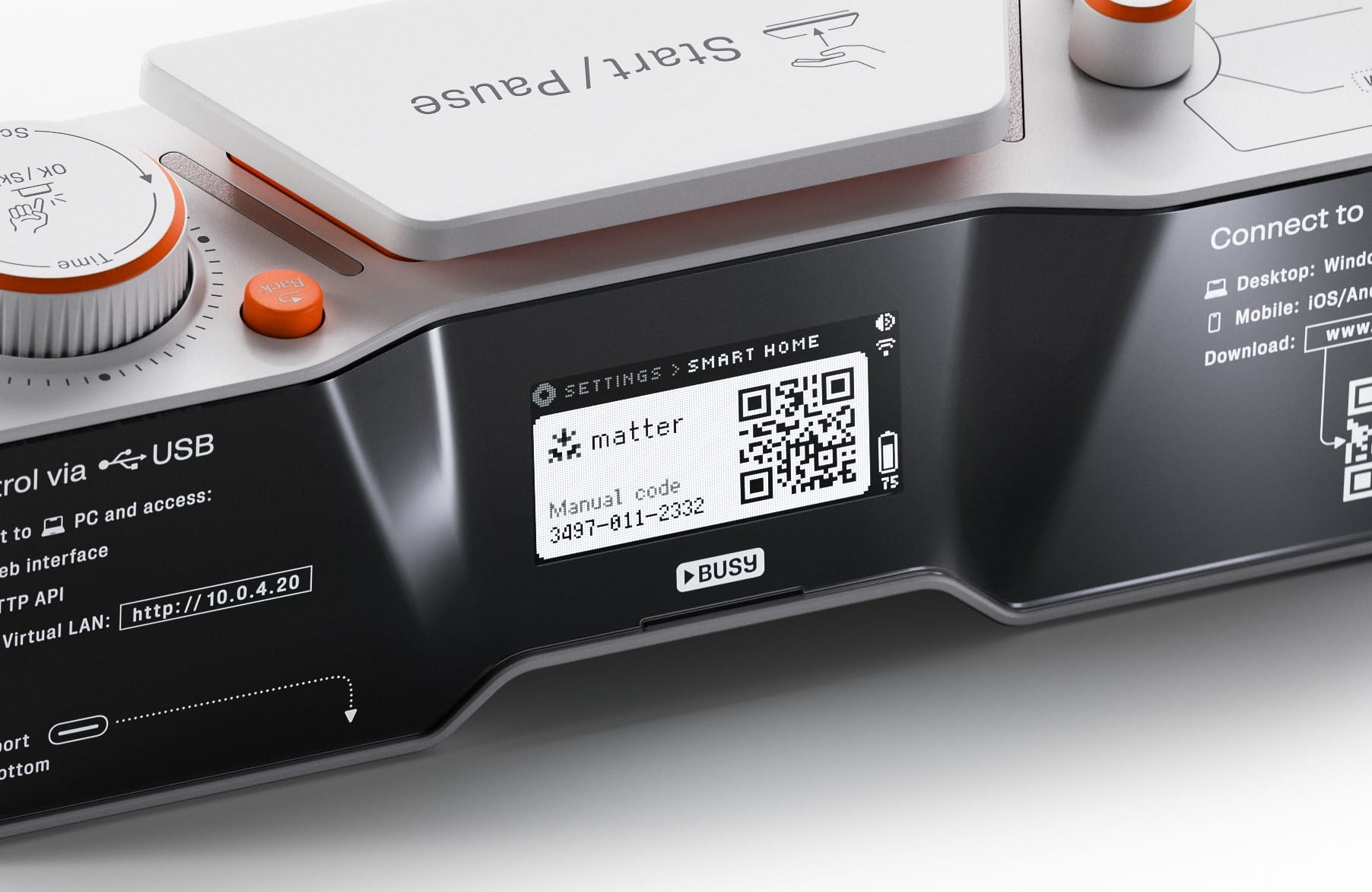 BUSY Bar can be connected to Apple Home, Google Home, Amazon Alexa, Samsung SmartThings, Home Assistant — or even multiple systems at once. All you need to do is scan the QR code on the BUSY Bar back screen using your smart home’s mobile app.
