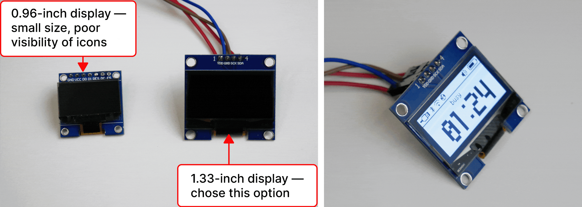 Initially, we wanted to use a backlit LCD display, but its contrast at a small size does not provide good visibility, so we settled on an OLED display with an I2C connection. In terms of display size, we chose between 0.96-inch and 1.33-inch options. The 1.33-inch variant has better visibility and more readable icons, so this variant was selected. We understand that an OLED burn-in is possible, but for now, we consider it the best option in terms of contrast. As a solution, an installed light sensor and brightness adjustment will extend the display’s life. If you think there are better options, please share them with us.