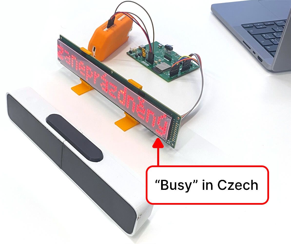 We were choosing a front display from ready-made variants, but no such displays would meet our size, pixel density, or price criteria. Therefore, we decided to make our own matrix on a custom board. To determine the size of the display, we tried to write “Busy” in the world’s main languages and see if the word fits. For symbols, 8 pixels in height is enough, and 64 pixels in width is the minimum value to fit the word “busy” in Czech — the longest variant among all. At this stage, the front screen matrix 64x8 pixels resolution was chosen.
