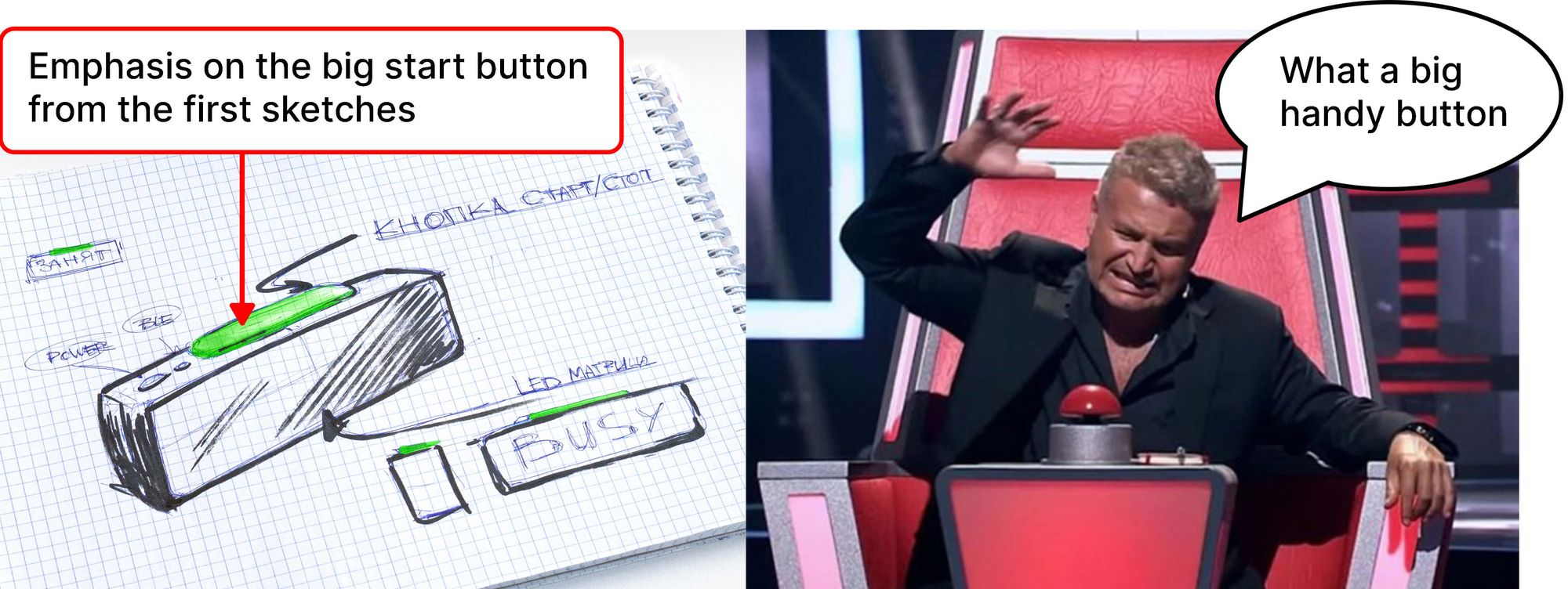 The start button has been moved to the top for convenience and stability. Due to its position, you can press it without looking, like hitting a button on a chess clock. This design was handier than any side buttons, toggle switches, or cable switches.