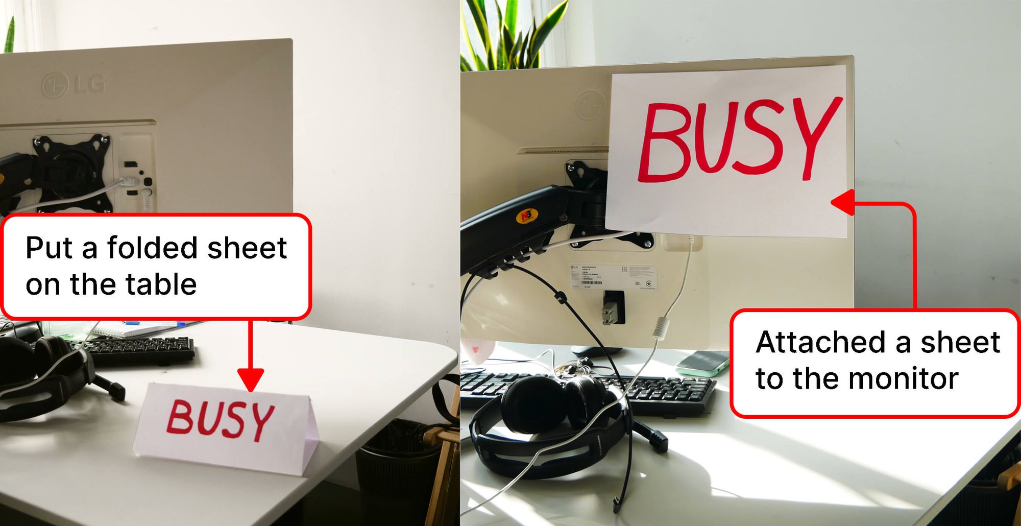 I put a paper sign on the table that said “BUSY”. Many did not notice and ignored it, then I began to stick a large sheet of paper to the back of the monitor, and it worked better. But then, in addition to setting the kitchen timer, I had to hang a sheet with my status and, when the timer expired, remember to take it down.