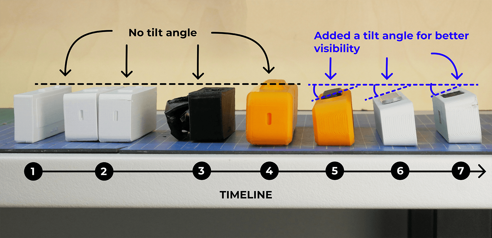 So far, we have made seven iterations, finalizing the shortcomings after each version: changing the dimensions, chamfers, and tilt angles. In the latest versions, the display is tilted so that a person standing next to the table can better see the displayed status.