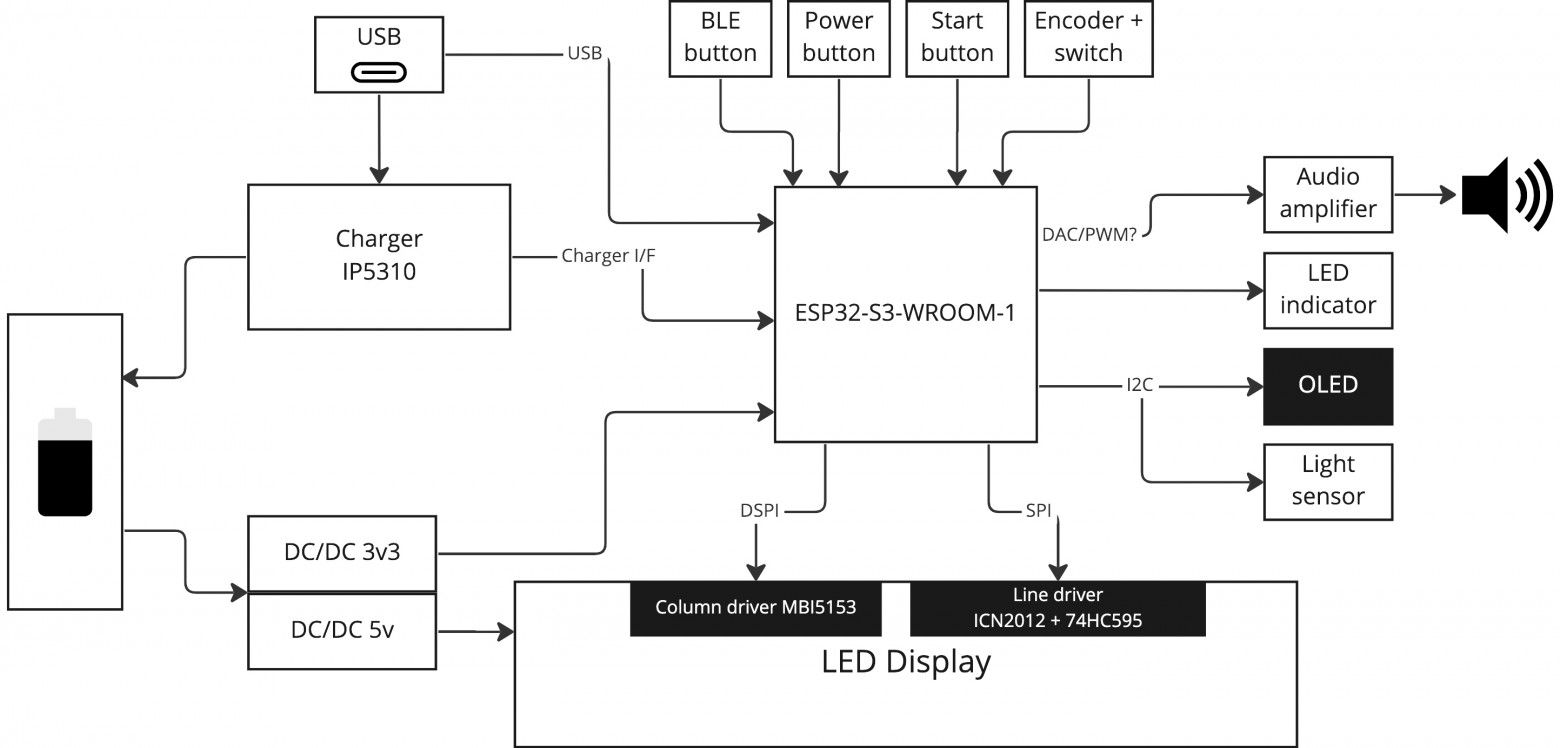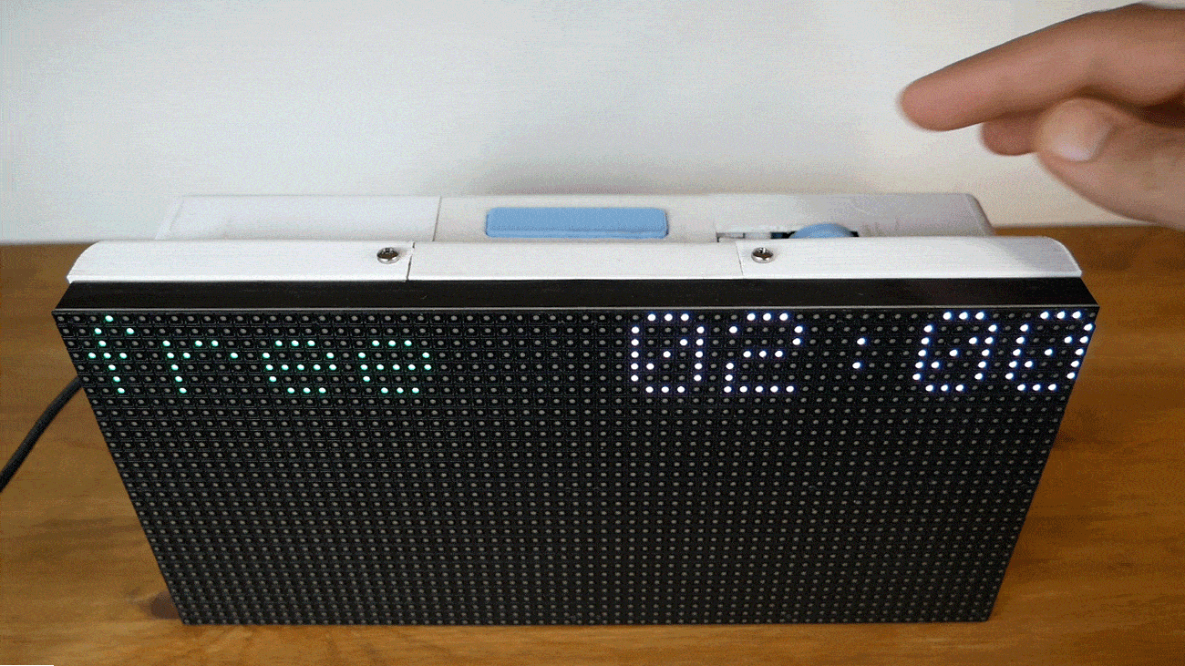 The status bar size was reduced to one line, which is enough to display the status and remaining time (pixel font 8x64 pixels). We did not find a ready-made matrix, so we decided to make our own. Due to the compact size, we wanted to be able to move the status bar from the outlet, for example, hang it on the door and activate the message DO NOT ENTER, so we decided to add a battery.