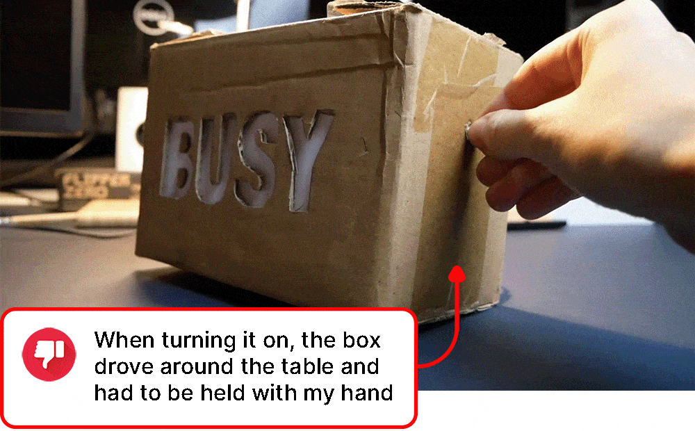 To replace the sheet of paper, I assembled a lamp out of a cardboard box with an LED strip inside and a toggle switch. Experimentally, I tried to choose the size and brightness of the text so that a person could see the sign even at a distance when approaching my desk.